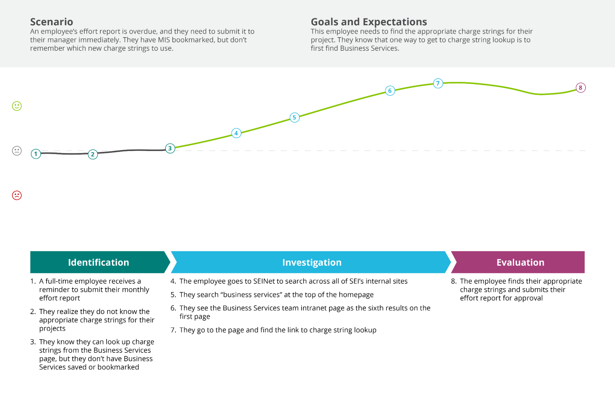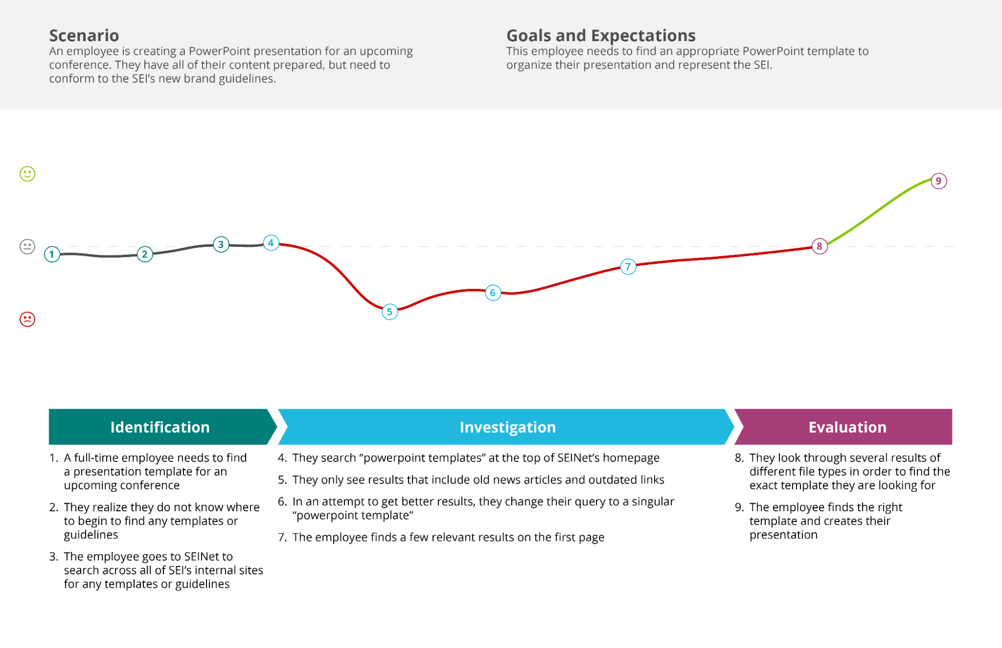 Below, you can follow the experience of each type of user in an example journey map, which lists and maps each step they complete in order to complete a task using search.